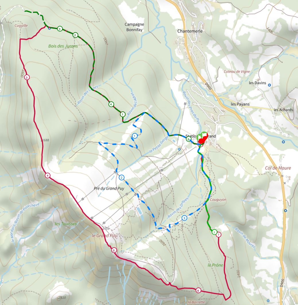 Balade sur une piste forestière (mixte piéton - raquettes selon les conditions d’enneigement). Possibilité de faire demi-tour à tout moment. Parcours commun avec un itinéraire de chiens de traineaux au départ du Grand Puy.