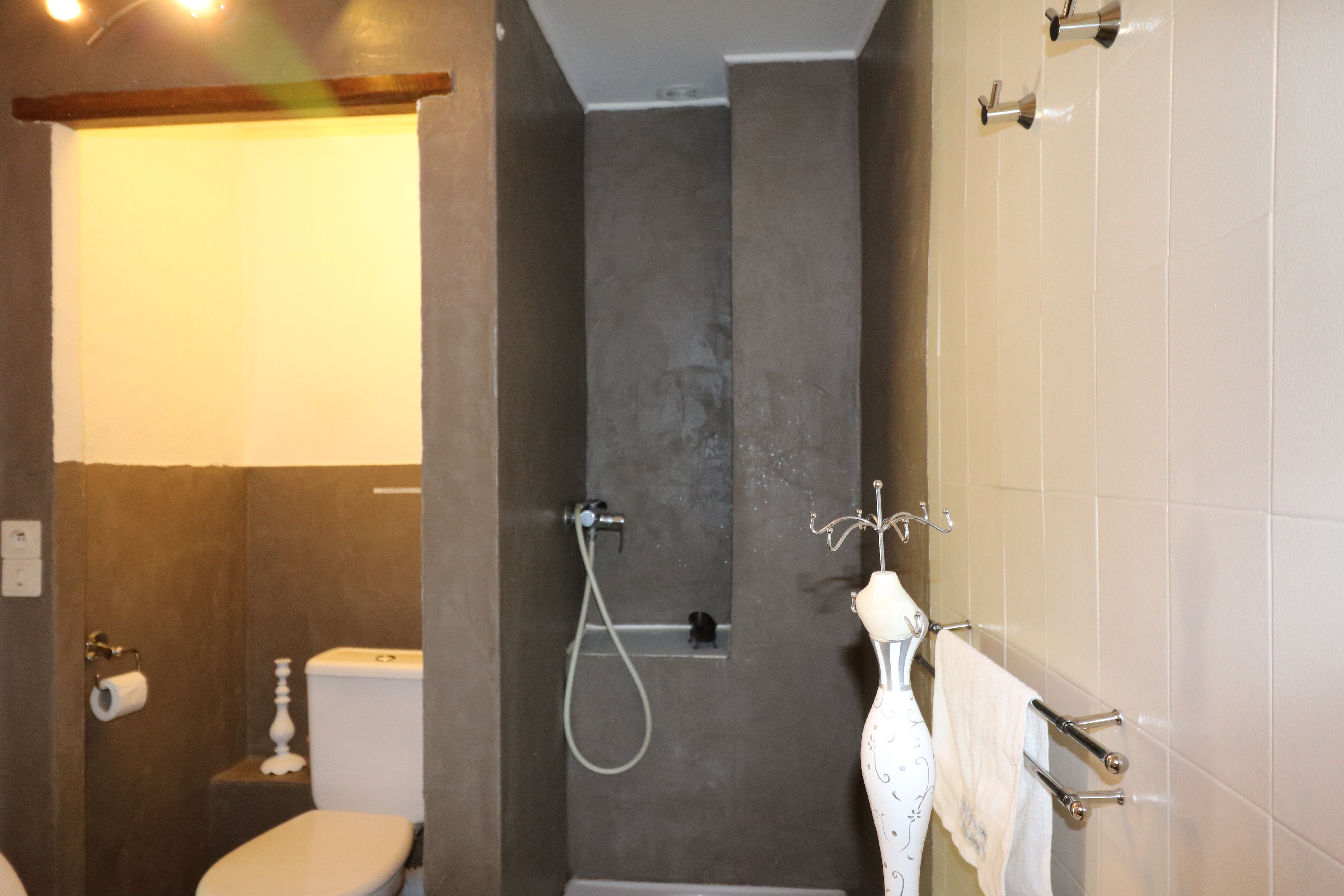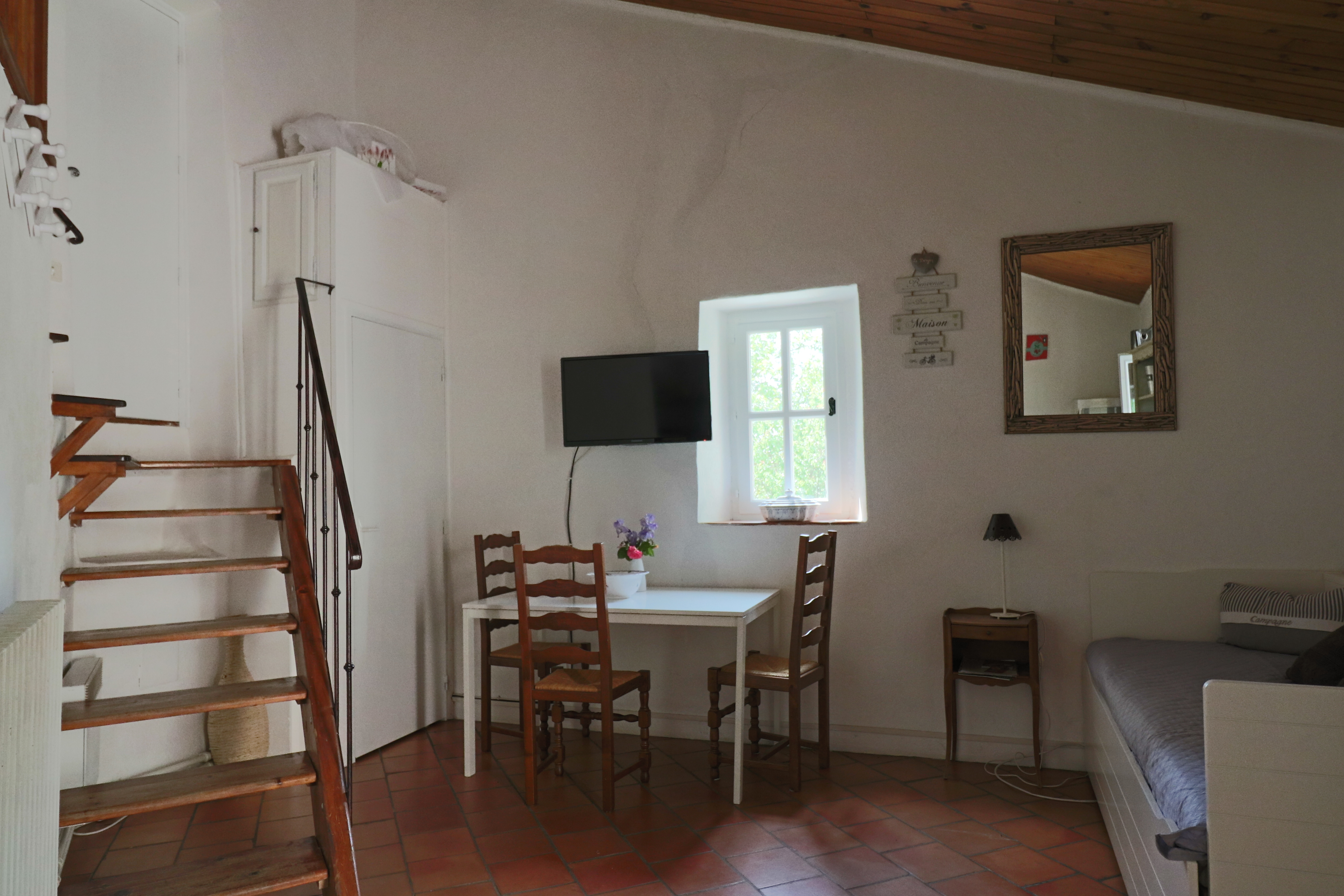 Un joli studio avec beaux volumes, portes fenêtres donnant directement sur l’extérieur avec grande terrasse sans vis à vis face à la forêt de chênes truffiers. Salon de jardin et barbecue .Il y a 4 marches pour accéder au studio.